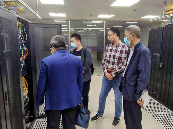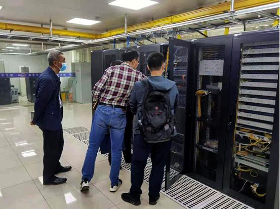 汇报会后,专家组一行前往学院核心机房实地考察。考察中专家组认真查看了机房的监控、消防、供电、新风、空调等系统的运行情况,并结合其他兄弟高校信息化建设情况,针对交换机、服务器、网络安全设备的组成和性能进行了经验交流。