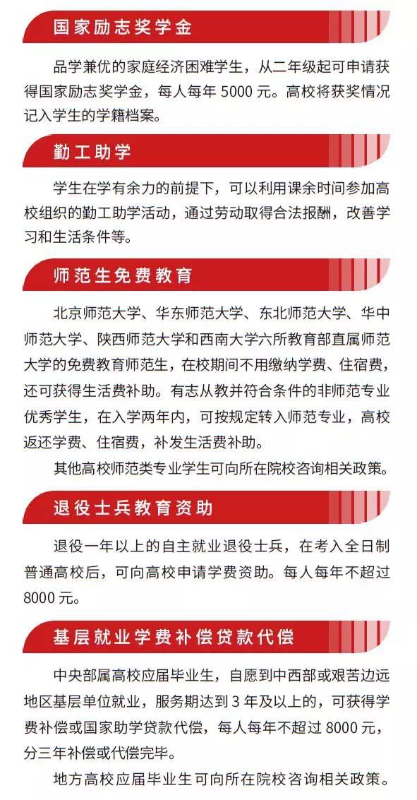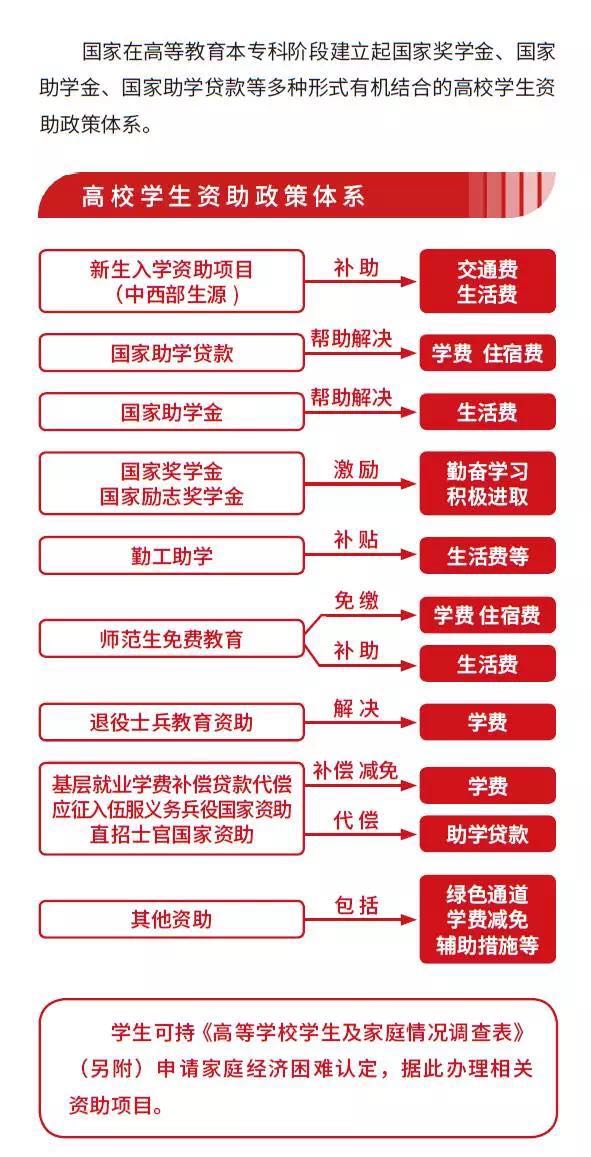 国家为了减轻家庭经济困难学生的经济负担,让同学们顺利入学、安心就读,为同学们提供了多项学生资助项目,我们的目标是:不让一个学生因为家庭经济困难而失学!