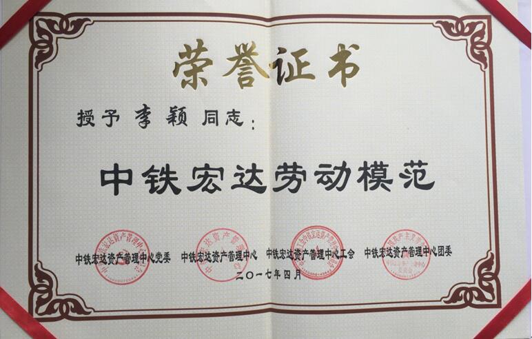 学院新闻 首页 > 新闻中心 > 学院新闻 > 正文 李颖副院长被授予“中铁宏达劳动模范”称号 作者:日期:2017-05-09 2017年4月25日中铁宏达中心在北京召开2017年工作会议,会上表彰了中铁宏达2016年度“四好”领导班子和中铁宏达劳动模范,我院教学副院长李颖同志被授予“中铁宏达劳动模范”称号。 这是中铁宏达自2007年组建以来第一次评选“中铁宏达劳动模范”,评选工作领导小组对上报的候选人及事迹材料进行了认真审核和评比,经中铁宏达党委会议研究决定,共有16名同志获此殊荣,我院李颖同志列其中。 希望学院全体教职员工以李颖同志为榜样,爱岗敬业、争创一流、艰苦奋斗、勇于创新,为推动学院改革发展做出新的更大贡献。
