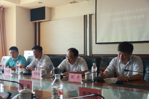 2015年9月16日--9月19日,中铁宏达党委书记、副主任何梦通,党委副书记、纪委书记、工会主席董晓明,党群工作部部长郭宇,综合部秘书吴世泽一行4人,在学院对党建思想政治工作暨党风廉政建设进行检查。学院院长韩仁海、党委书记上官凤、工会主席李洪涛、副院长邹德奎、副院长郦洪晨、团委书记马绍南、宣传部长王秋刚、组织部长杨振生等分别向何书记汇报各自工作,并陪同检查新校区。