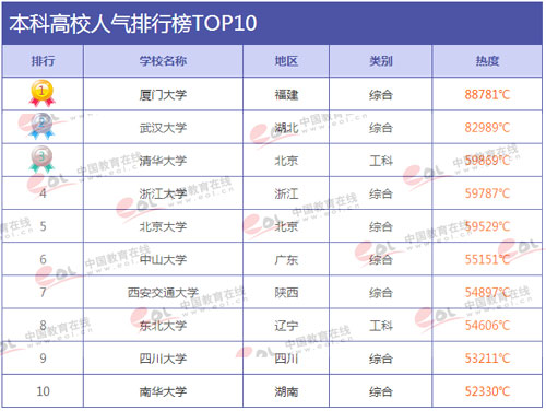 (据凤凰网消息) 4月16日,中国教育在线发布“2015年最具人气大学排行榜3月榜TOP10”名单,其中,厦门大学稳居本科高校榜首,成为3月份最受欢迎的本科高校。武汉大学、清华大学分列第二、三名,北京大学跌出榜单前三。在专科高校排行中,辽宁省交通高等专科学校、芜湖职业技术学院、beats365官网成为考生关注的前三甲。