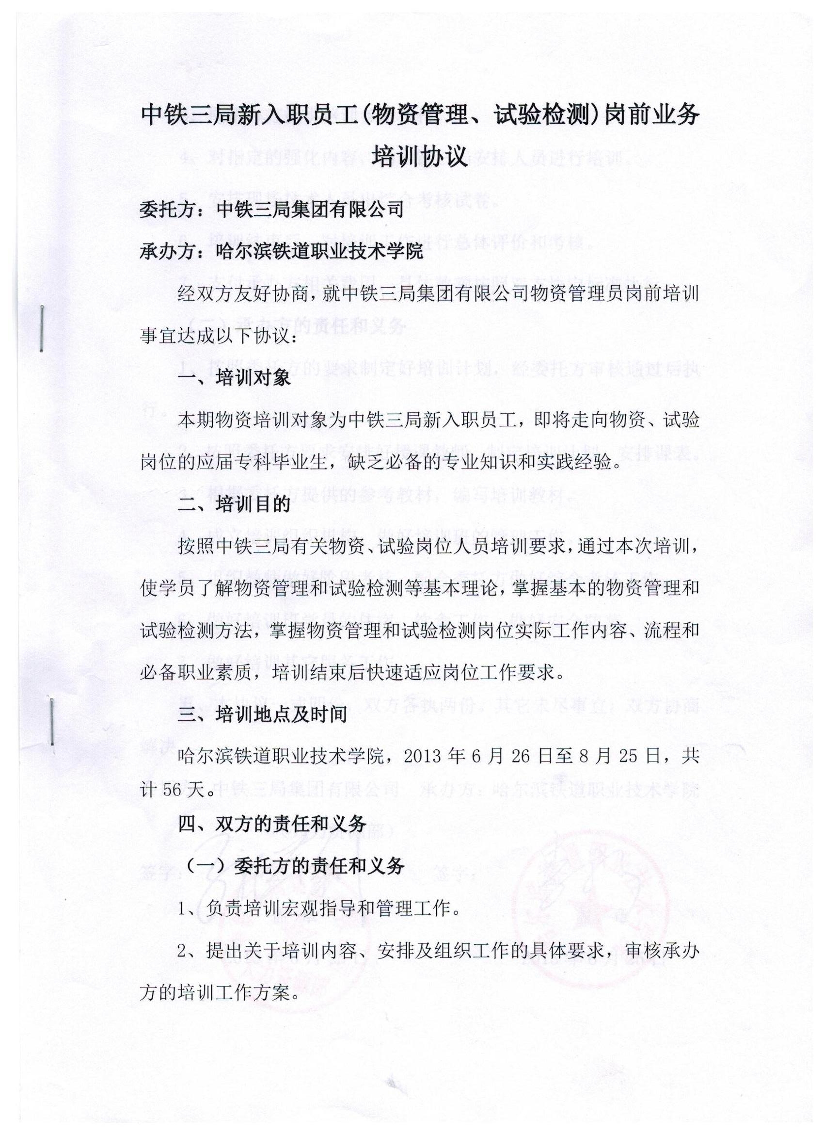 本次培训将由我院专业教师和三局物资管理、试验检测技术人员共同完成,将按照中铁三局有关物资、实验岗位人员培训要求,对即将走向物资、实验岗位的应届毕业生进行岗前培训,使学员了解物资管理和试验检测等基本理论,掌握基本物资管理和试验检测的方法,掌握物资管理和试验检测岗位实际公平那个做内容、流程和必备职业素质,培训后快速适应岗位工作要求。