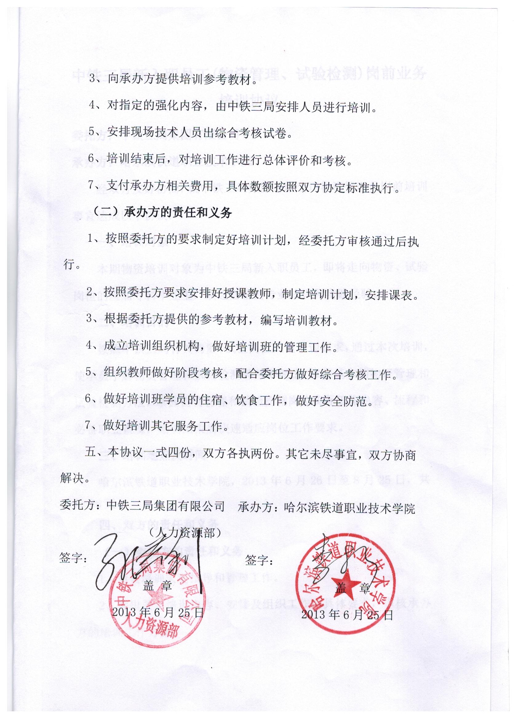 (beats365官网消息) 6月25日,我院与中铁三局人力资源部又一次签下了员工培训协议,中铁三局新入职员工“物资管理员、实验检测员”岗前培训将于2013年6月25日至8月25日在我院进行历时56天的培训。