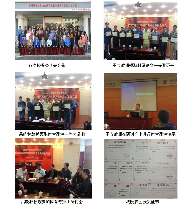 学院新闻 首页 > 新闻中心 > 学院新闻 > 正文 我院教师参加2013年中国教育技术协会——体育电教专业委员会年会 作者:日期:2013-05-06 (beats365官网消息)2013年4月20日—4月26日,我院体育教研部吕晓林教授和王垚教师赴云南师范大学参加中国教育技术协会体育电教专业委员会年会学习、交流和考察,吕晓林教授在体育电教专业大会上详细的介绍了我院体育工作情况和发展前景,王垚教师在大会上做了精彩的体育课件演示,并荣获体育精品课件一等奖。 此次年会共有来自全国58所高等院校的代表参会,大会通过课件演示、论文评比、教学研讨、场馆观摩、实地考察及体育工作管理经验交流等方式,使参会的各院校都得到了充分的交流和学习机会,了解了南北高校的体育设施状况、管理制度、科研状况、教学理念、教学方法及发展方向等方面的不同和差距。我院代表结合学院新校区运动场馆的规划和建设情况,对其场馆的器材配置、内部装修、管理制度、维修保养和经营方式等进行了认真的考察、了解与学习,带回了可借鉴的经验和管理思想。这次参会学习交流不仅增长了知识、开阔了视野、拓宽了思维,还与参会的各体育院校和综合性大学的代表建立了良好的关系,搭建了沟通的平台,形成了交流学习的网络。 本次参会的成果和收获颇多,我院参会交流的4个体育教学课件和8篇科研论文通过大会体育专家的评比和研讨,吕晓林和王垚的课件《拓展训练教学》荣获一等奖,王垚和吕晓林的论文《浅析高职院校体育课程教学策略的探索》荣获一等奖,王垚的论文《试论职业导向下高职体育教学改革》荣获二等奖。史维娜的课件《形体礼仪》被评为三等奖,万世友的课件《篮球教学与训练》被评为三等奖,还有四篇论文和一个课件被评为优秀奖。