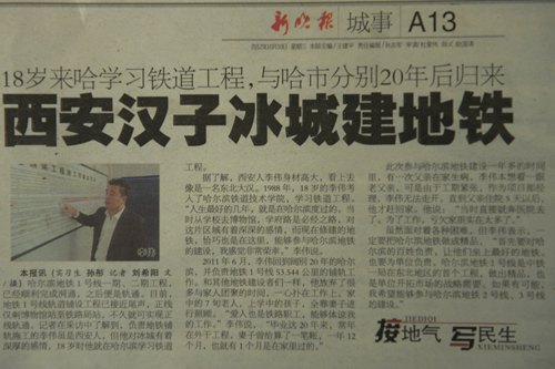 10月10日哈尔滨《新晚报》A13版以《西安汉子冰城建地铁》为题介绍了学院毕业生李伟在哈进行地铁施工的情况,引来学院师生的关注。李伟,1988年考入学院铁道工程专业。1992年毕业分配到中铁一局。