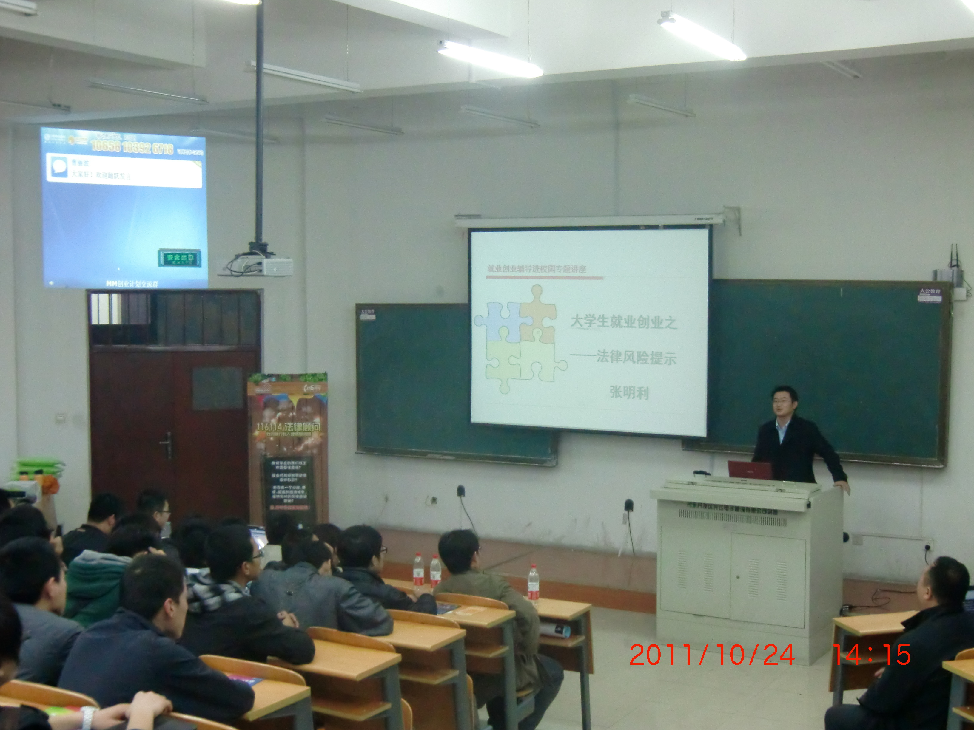 所张明利律师,三位“大学生就业创业服务团”的讲师,为来自我院不同专业的近300名学生代表进行了就业创业辅导讲座。他们分别从就业观念、创新能力、实践经验以及就业创业中涉及的法律常识进行了详细的讲解,并不时与现场同学进行互动。为同学们掌握就业创业的各项技能、提高竞争意识和择业能力奠定了基础。