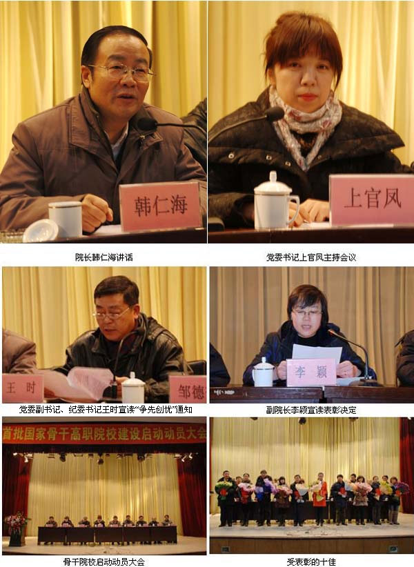 会议由党委书记上官凤主持,副院长李颖首先宣读了教育部、财政部《关于确定“国家示范性高等职业院校建设计划”骨干高职院校立项建设单位的通知》,随后宣读《关于表彰学院申办国家骨干高职院校十佳的决定》。党委副书记、纪委书记王时宣读学院党、政、工、 团联合下发的《关于开展建设国家骨干院校,争创先进集体、争做先进个人活动的通知》和《关于以建设国家骨干院校为载体深入开展争先创优活动的通知》,并号召全体党员干部以骨干院校建设为载体,深入开展争先创优活动。