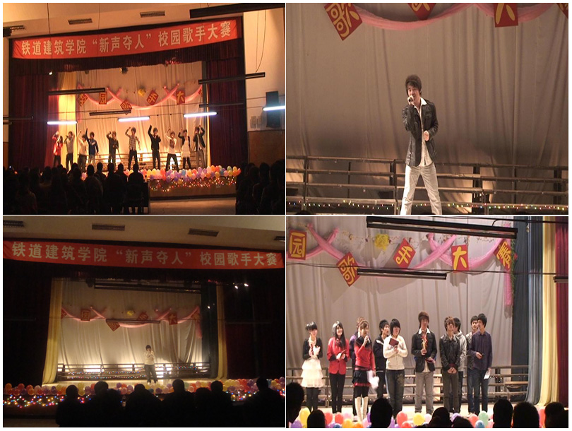 学院新闻 首页 > 新闻中心 > 学院新闻 > 正文 铁道建筑学院“新声夺人”校园歌手大赛简讯 作者:日期:2010-03-24 为活跃校园文化,铁道建筑学院在2010年3月22日下午四点举办了“新声夺人”校园歌手大赛总决赛。 比赛现场,选手们以自己美妙激昂的歌声尽显青春的风采,在优美的音乐旋律伴奏下,淋漓尽致的现场发挥,彰显了当代大学生的精神风貌,展现我院校园学生风采。经过近两小时的激烈角逐,工程造价三班张宇光同学获得第三名,铁道工程十班胡凡同学获得第二名,高速铁路一班范庆涛同学容得本届校园歌手大赛桂冠。