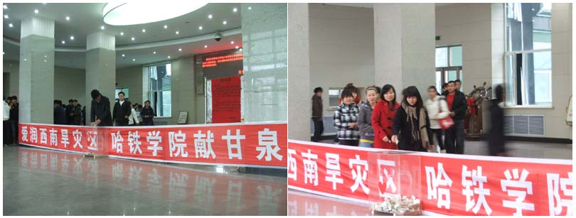 大旱无情,人有情,西南地区罕见旱情,牵动着亿万同胞的心。3月25日团中央、全国少工委联合发出通知,要求各级共青团组织迅速响应党中央号召,积极组织动员广大团员青年投身抗旱救灾斗争,开展“捐赠一瓶饮用水”活动。3月26日学院团委向全院共青团员发出倡议,为灾区同胞献出一份爱心,送去一份祝福。截止到3月30日累计收到爱心捐款近万元,此款项已于第一时间送到哈尔滨团市委。希望用我们的点点爱心能够帮助灾区人民早日渡过难关,同时通过开展“捐赠一瓶饮用水”的活动进一步提高同学们“保护水资源、节约每滴水”的环保意识。