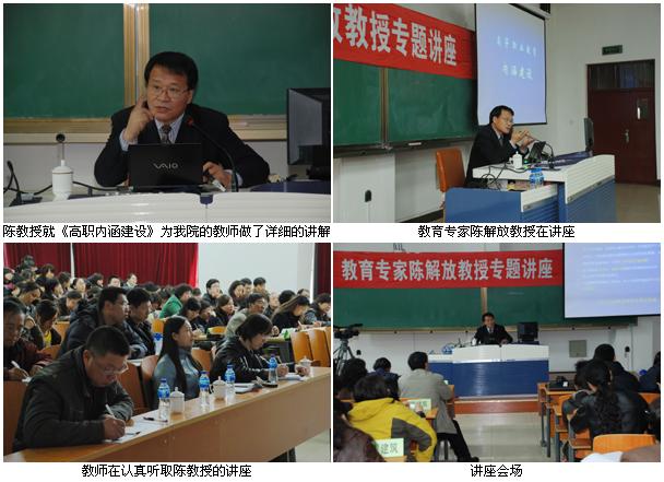 为了进一步提高广大教职工对于高职教育的理性认识,为示范校建设工作打好理论基础,我国教育专家、世界合作教育协会理事、全国高职高专校长联席会议秘书长、上海产学合作教育协会执行副秘书长、中国产学研合作教育协会副秘书长、上海第二工业大学高教研究所所长陈解放教授受邀以《高职教育内涵建设》为主题,来我院做专题讲座。