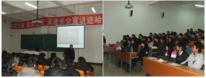 学院新闻 首页 > 新闻中心 > 学院新闻 > 正文 珍爱生命 安全出行 作者:日期:2010-03-23 为提高同学们交通安全意识,增强事故防范能力。3月22日下午,学院团委特邀哈尔滨市交管委刘再军等六名警官对部分2008级即将实习的学生作了一次主题为“珍爱生命、安全出行”的交通安全知识讲座,宣讲中刘警官运用典型的交通事故案例,加强对学生的警示教育,引导学生自觉抵制各种交通违法行为,文明参与交通,杜绝事故伤害。通过此次宣讲,进一步加深了同学们对交通法规和交通安全常识的认识,提高了自身安全防范能力,达到了宣传教育的目的。 团 委 2010年3月23日