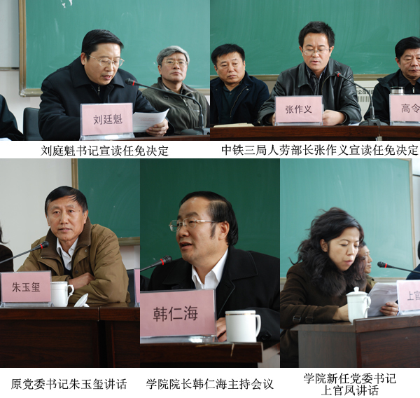 中国中铁宏达资产管理中心主任、党工委副书记刘庭魁代表中共中国铁路工程总公司委员会宣读了任免通知:免去朱玉玺beats365官网党委书记、党委委员职务,任调研员的决定,任命上官凤为beats365官网党委书记。中铁三局劳人部部长张作义宣读了任命李颖、郦洪晨同志任beats365官网副院长职务;李洪涛同志任beats365官网工会主席职务;副院长王惠明、马雷同志因年龄原因内部退养,不再担任学院领导职务。