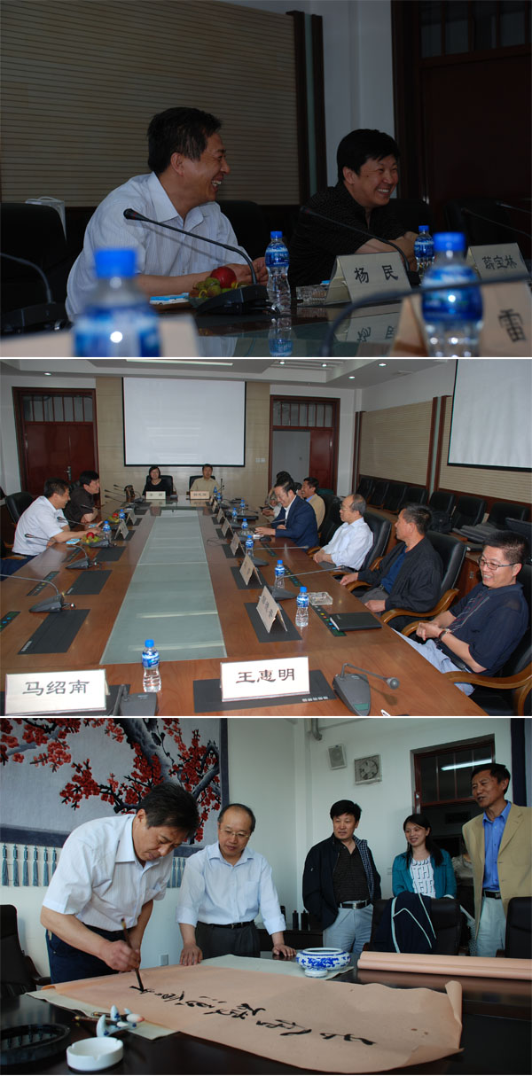 座谈在热烈而友好的气氛中进行,双方学院的领导就二个学院在今后教育、科研交流互助等方面进行了磋商,最后齐师院党委杨珉书记为我院题字留念。