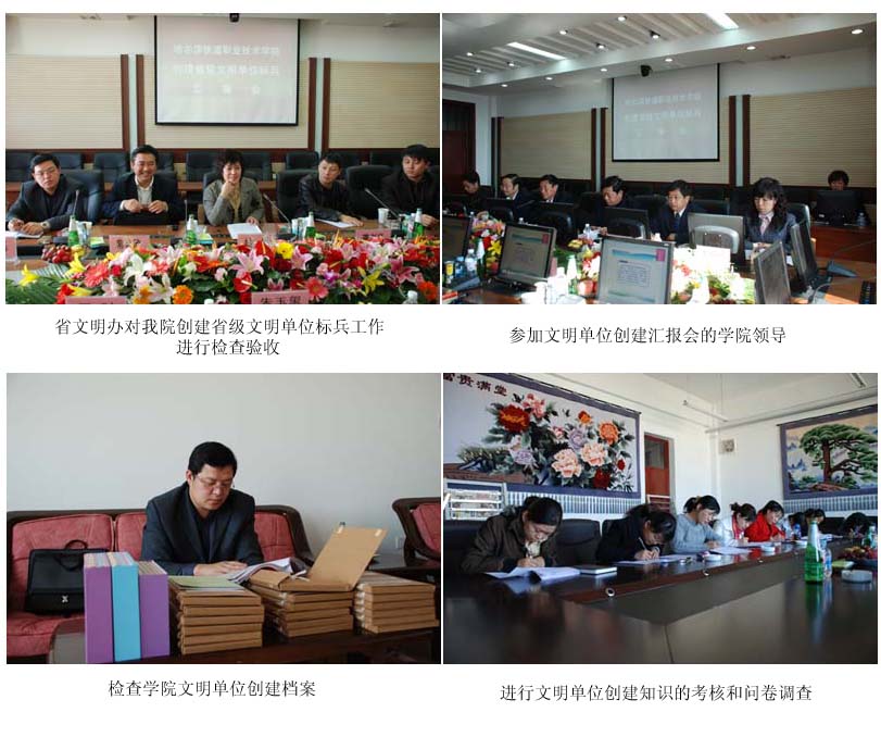 10月27日,由省文明办、哈尔滨市文明办和南岗区文明办的领导组成的2008年省文明单位创建领导检查组一行七人莅临我院,对学院自2007年至2008年创建省级文明单位标兵工作进行检查验收,检查组在听取学院党委朱玉玺书记的汇报后,分别召开了由学院教职工参加的座谈会、进行了文明单位创建知识的考核和问卷调查并检查了学院文明单位创建档案。