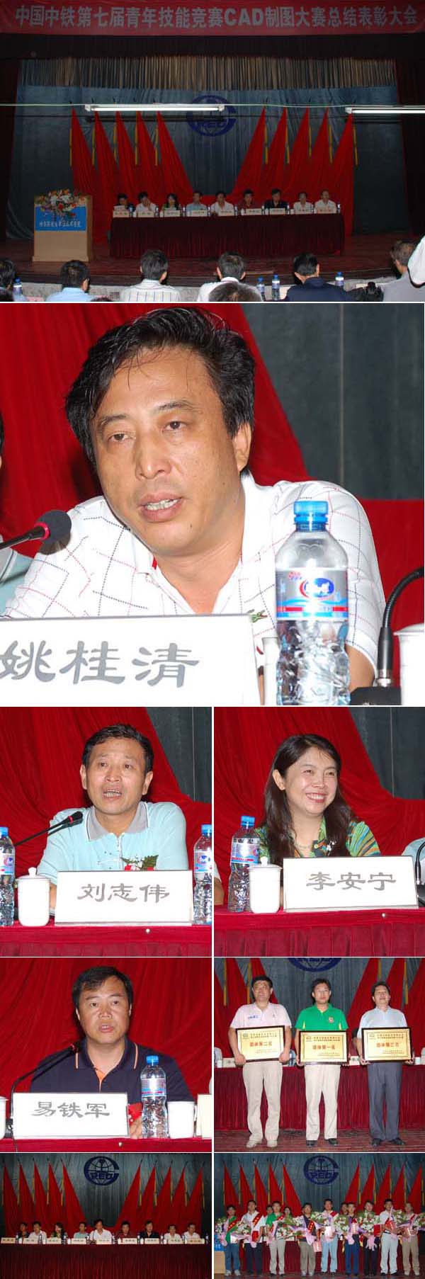 2008年8月7日上午8:00,中国中铁第七届CAD技能大赛闭幕式在我院礼堂召开,会议由股份公司团委书记李新生主持。公司工业设备部李安宁部长宣布了比赛结果,中铁六局、中铁建工集团和中铁大桥局分获大赛团体总分前三名,大赛个人前15名依次是:王令侠(中铁大桥局)、吴晓轩(中铁六局)、胥民尧(中铁二院)、邹海涛(中铁建工集团)、林军科(中铁宝桥)、王义彪(中铁六局)、李智(中铁三局)、艾丹(中铁六局)、杨久林(中铁隧道局)、狄国庆(中铁建工集团)、张合超(中铁隧道局)、张鹏宏(中铁八局)、陈树亮(中铁电气化局)、黄锋(中铁大桥局)、朱培(中铁六局)。中国中铁股份有限公司人力资源部刘志伟部长对此次竞赛情况进行了全面的点评,对我院的承办工作给予了高度肯定,中铁三局集团有限公司党委副书记、纪委书记易铁军代表承办单位对获奖参赛选手表示了祝贺,公司党委副书记、副总裁、工会主席姚桂清出席了闭幕式并做了重要讲话,姚书记亲切地向参赛选手介绍了自己年轻时从参加青工比武到组织单位青工比武的感受,语重心长的鼓舞参赛选手,鼓励他们努力工作,加强学习,力争成为公司10余万青工中的佼佼者,为总公司发展建设建功立业。姚书记还介绍了公司目前各项情况,对我院为大赛的成功举办而付出的辛勤工作表示感谢。