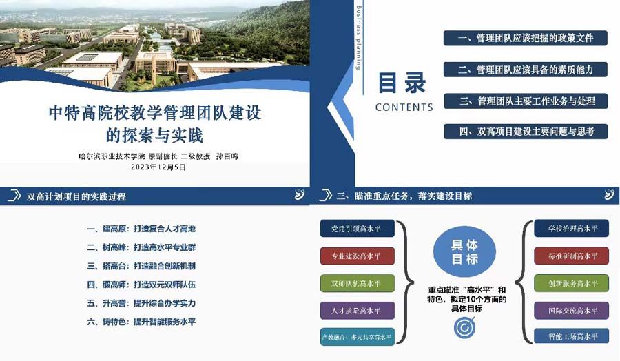 孙百鸣教授以《中特高院校教学管理团队建设的探索与实践》为题,从管理团队应该把握的政策文件、管理团队应该具备的素质能力、管理团队主要工作业务与处理、双高项目建设主要问题与思考四个方面进行讲解。