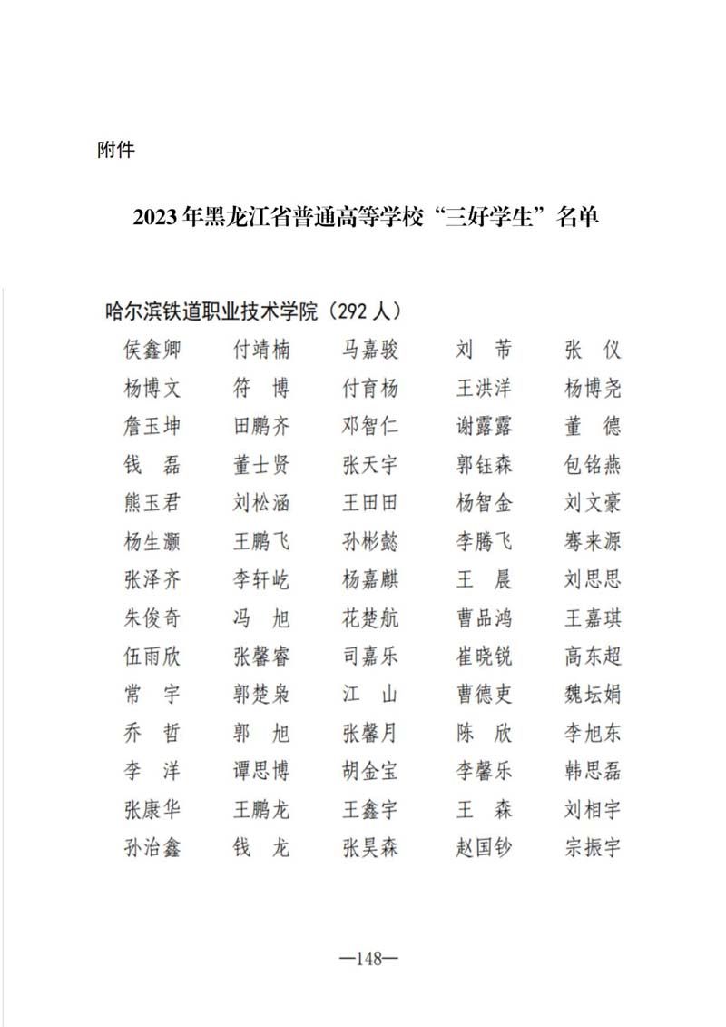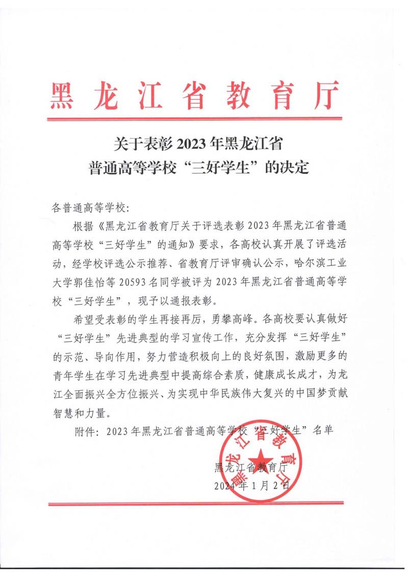 学院新闻 首页 > 新闻中心 > 学院新闻 > 正文 我院292名学生荣获2023年黑龙江省普通高等学校“三好学生”荣誉称号 作者:学生处日期:2024-01-05 1月2日,黑龙江省教育厅发布《关于表彰2023年黑龙江省普通高等学校“三好学生”的决定》,我院共有292名同学获得省“三好学生”荣誉称号。希望受到表彰的同学再接再厉,勇攀高峰。希望全体学生汲取榜样力量,踔厉奋发前行。