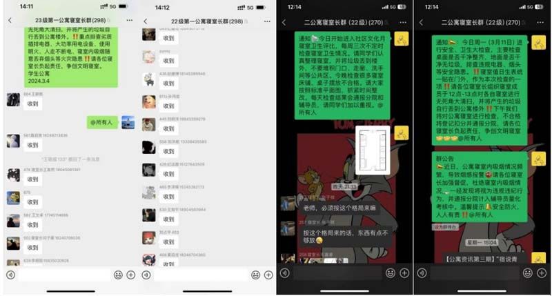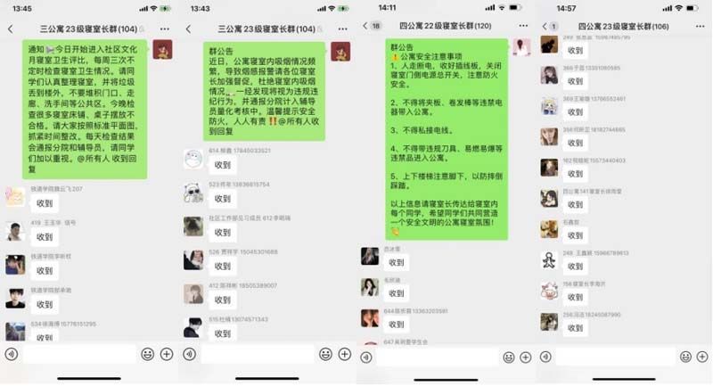 “居安思危,防患未然”,根据“一站式”学生社区建设“八个一”文件要求,公寓辅导员常态化在寝室长群进行了安全知识的宣传,引导学生养成良好的行为习惯,共同构建环境整洁、安全和谐的公寓环境。