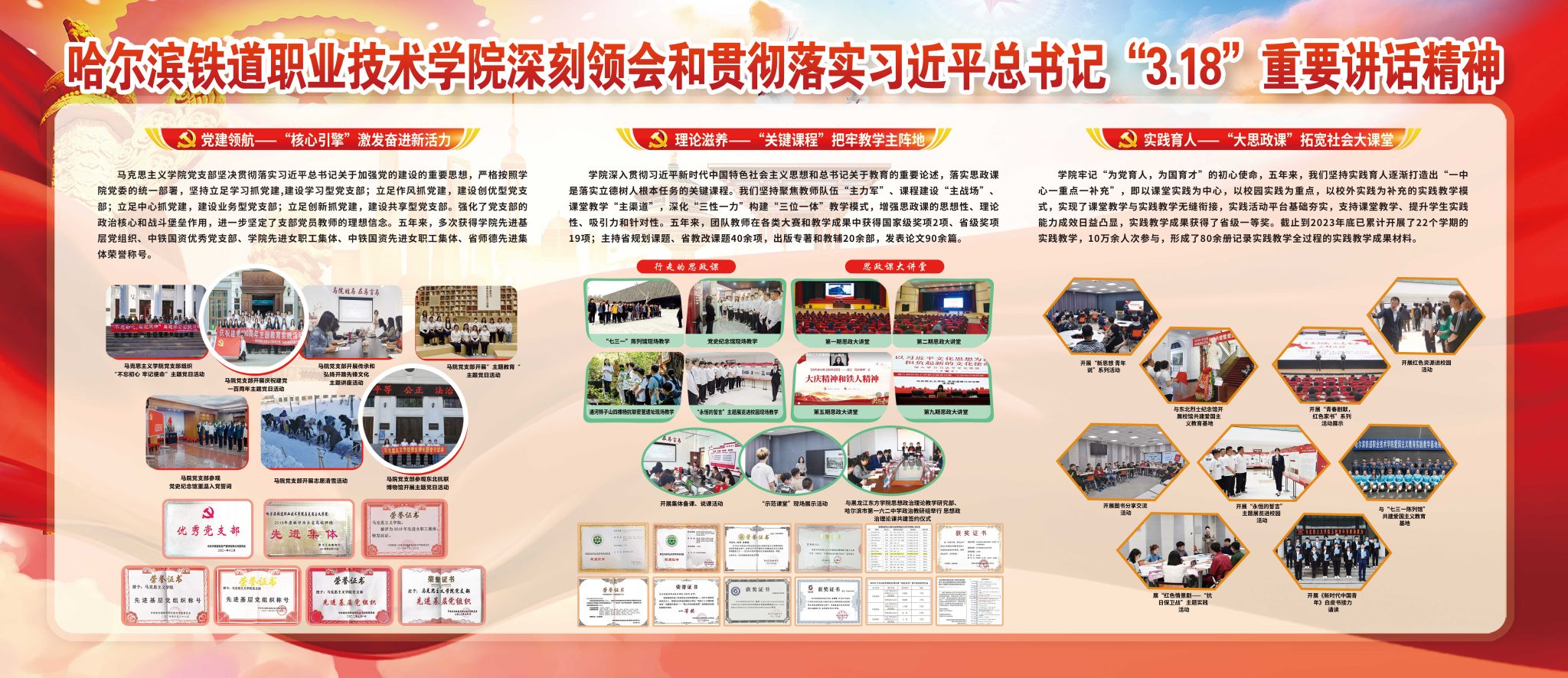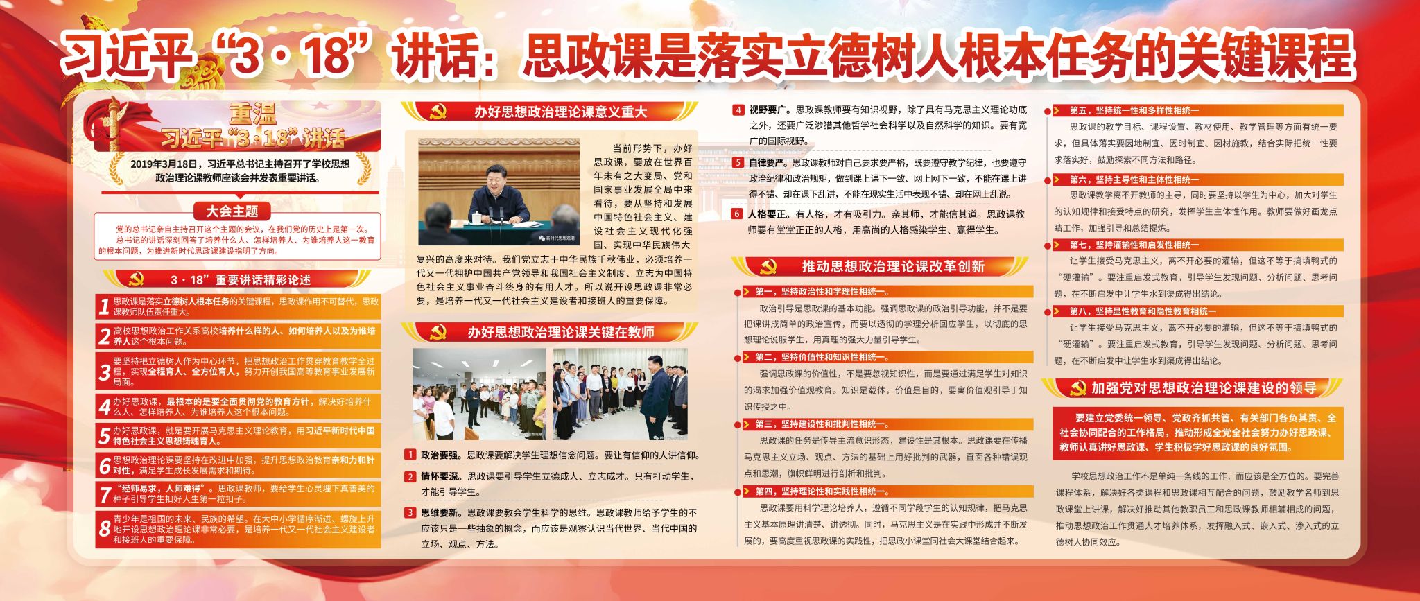 2019年3月18日,习近平总书记主持召开学校思想政治理论课教师座谈会并发表重要讲话,从党和国家事业长远发展的战略高度出发,深刻阐明学校思政课的重要意义,就如何办好新时代思政课作出部署、提出要求,是思政课教师的行动指南,为培养担当民族复兴大任的时代新人提供了重要遵循。五年以来,学院深入贯彻习近平新时代中国特色社会主义思想和“3•18”重要讲话精神,落实好立德树人根本任务。在总书记“3•18”重要讲话发表五周年之际,学院特举办系列活动,运用校园网、公众号、展板、广播站、电子屏等多种渠道开展宣传,全面回顾总结五年来的工作,献礼“3•18”重要讲话发表五周年,激励全体思政课教师不忘初心、牢记使命!
