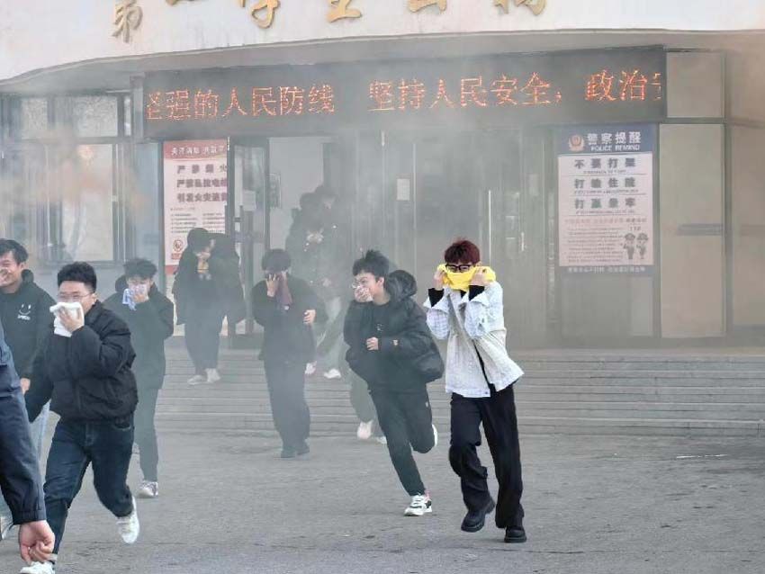 14时00分,火警警报在学生公寓响起,橙色烟雾迅速蔓延。公寓管理员使用广播通知所有人员发生火情立即撤离,全部演练人员从模拟火场撤离到校园安全区域,历时三分钟。14时05分,消防救援队抵达现场展开火灾扑救。