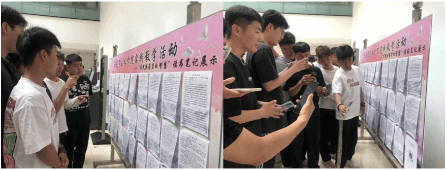 本次实践教学活动分为两个环节。第一个环节是优秀读书笔记征集评选活动,6月17日开始,将优秀读书笔记在综合楼一楼大厅进行展示。活动中,教师引导学生阅读总书记的著作,指导学生在“读原文”的同时,通过摘抄原文的方式“学原文”,用写感想体会的方式 “悟原理”,强化了学生对党的创新理论的核心要义、精神实质、丰富内涵、实践要求的深刻理解,从而增强历史使命感,珍惜我们党所取得的成就,进一步激发他们向上向前奋进的力量。读书笔记征集活动历时两个多月,千余名同学们踊跃参加,最终,29位同学的读书笔记在初赛中脱颖而出,进入决赛。该展示受到了学生的欢迎和关注,众多学生驻足观看,积极参与二维码投票,评选出“我心中的最美笔记”1篇,杨时荣同学的读书笔记获此殊荣。