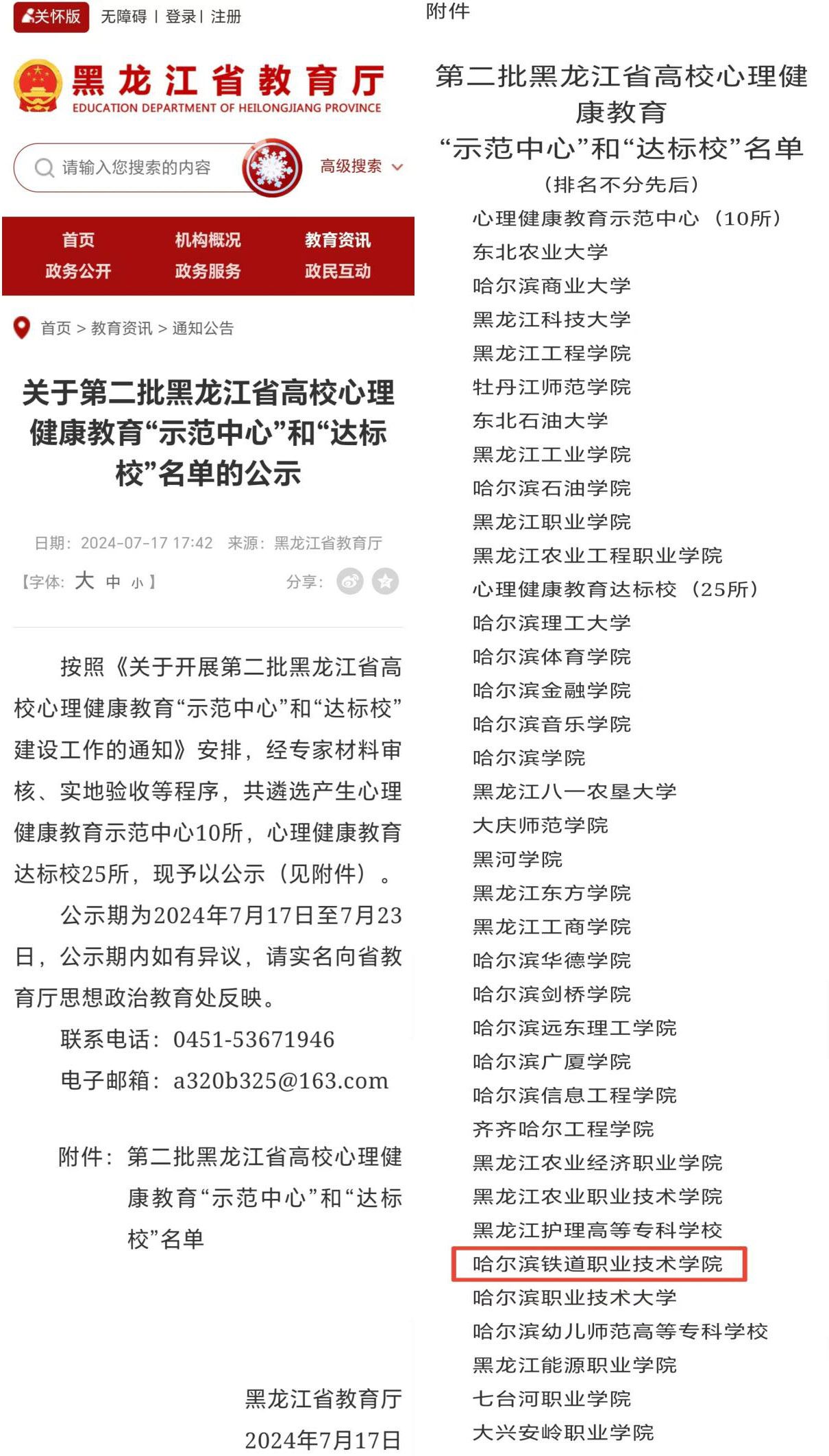 近日,黑龙江省教育厅发布了《关于第二批黑龙江省高校心理健康教育“示范中心”和“达标校”名单的公示》,我院获选黑龙江省第二批高校心理健康教育“达标校”。