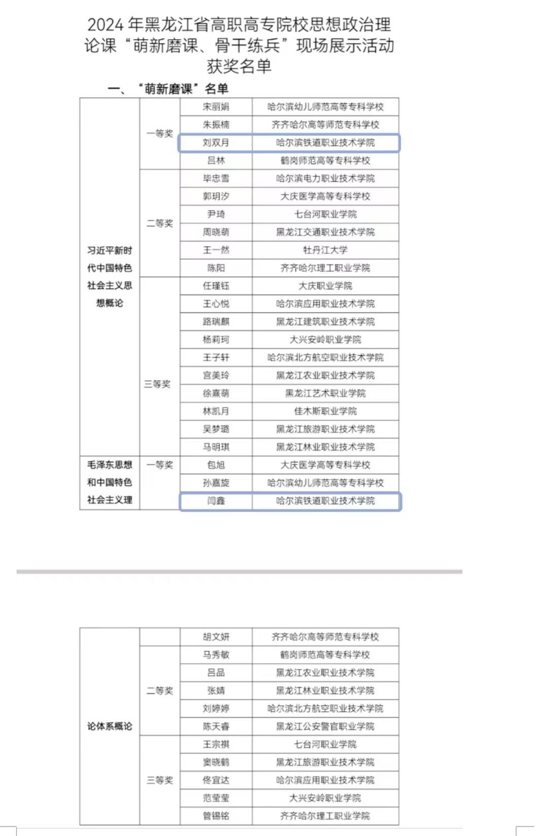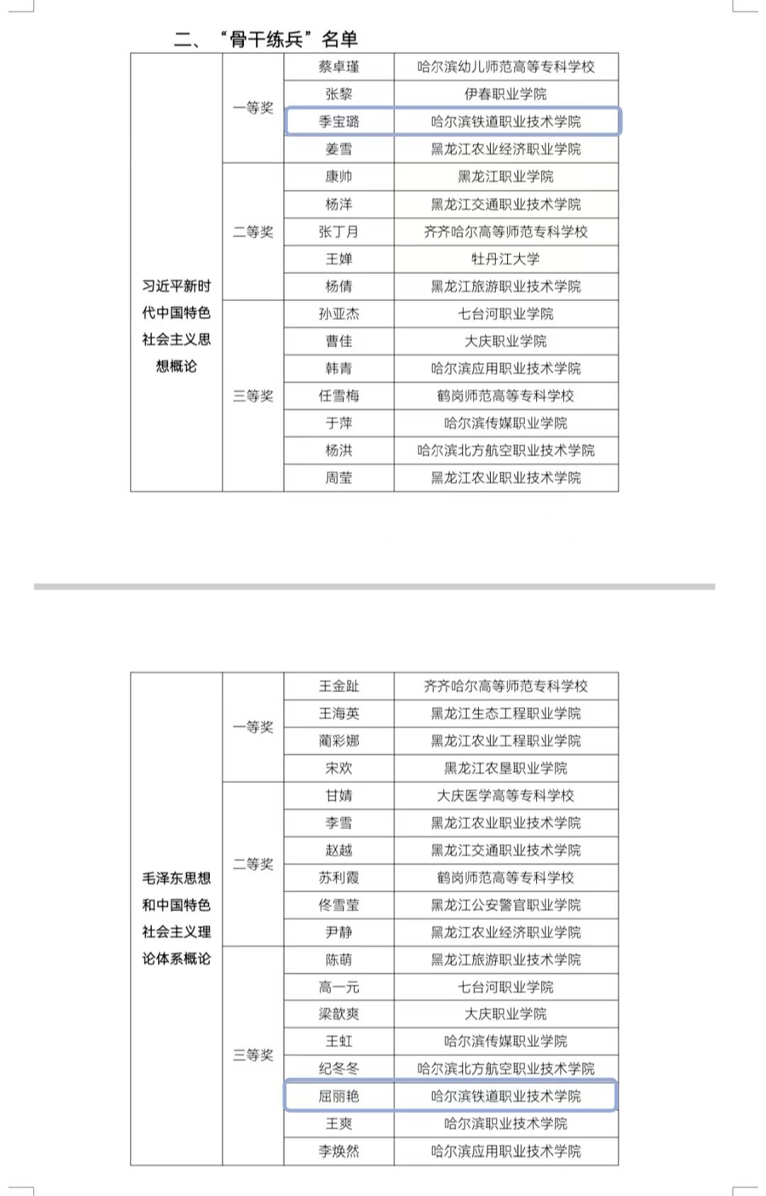 7月30日,由黑龙江省高等学校思想政治理论课教学指导委员会主办的2024年全省高职高专院校思想政治理论课“萌新磨课、骨干练兵”现场展示活动在黑龙江生态工程职业学院举行,共有来自省内高职院校的38名教师参加现场展示活动。我院马克思主义学院教师刘双月、闫鑫分别获得“萌新磨课”一等奖,季宝璐、屈丽艳分别获得“骨干练兵”一等奖和三等奖。其中一等奖获得者刘双月、闫鑫、季宝璐,被推荐至国赛,将代表黑龙江省参加国赛选拔。