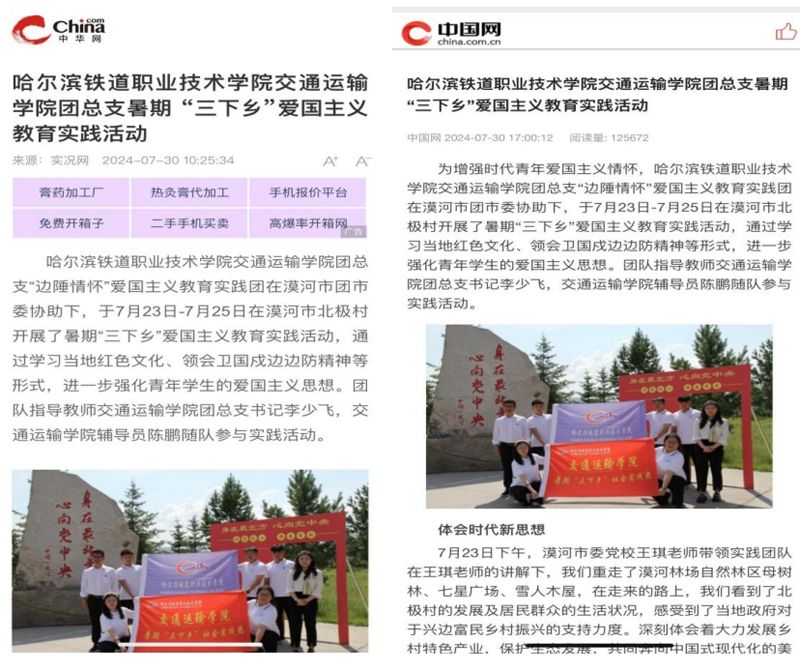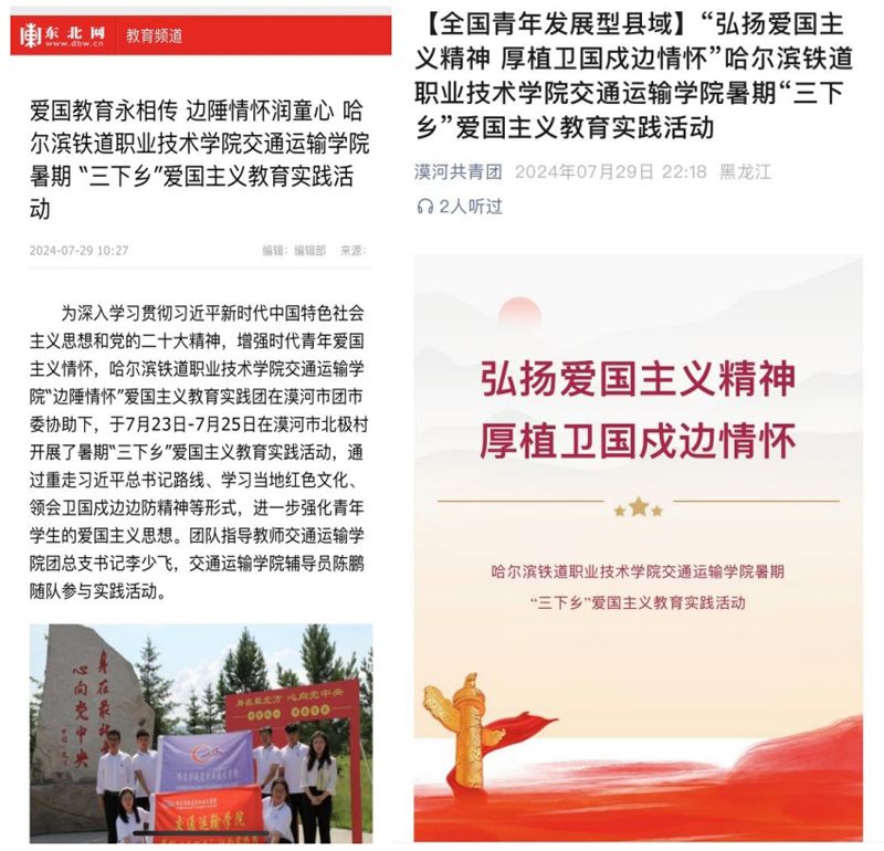 其中校级重点团队“边陲情怀”爱国主义教育社会实践团队此次“三下乡”社会实践活动被中华网、中国网、东北网、漠河共青团等报道。