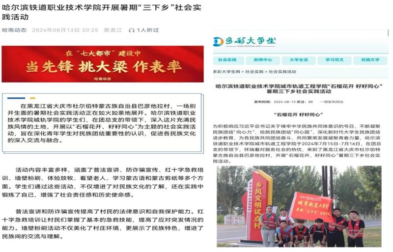在黑龙江省大庆市杜尔伯特蒙古族自治县巴彦他拉村,一场别开生面的暑期社会实践活动正在如火如荼地展开。城轨学院团总支书记翟吉辉的带领同学们,深入这片充满民族风情的土地,开展以“石榴花开,籽籽同心”为主题的社会实践活动,旨在深化青年学生对民族团结重要性的认识,促进各民族文化的深入交流与融合。