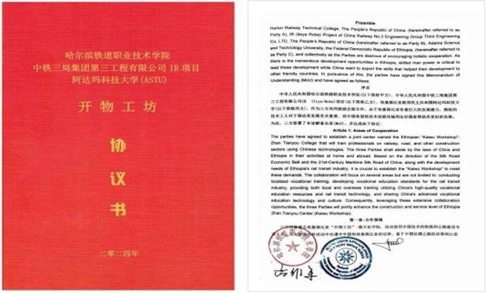 近日,在黑龙江省教育厅的关怀和指导下,在中铁三局的支持和帮助下,学院与中铁三局集团有限公司、埃塞俄比亚阿达玛科技大学共建的埃塞俄比亚“开物工坊”-詹天佑学院(以下简称“开物工坊”)完成签约,这是学院国际化进程中又一新突破。