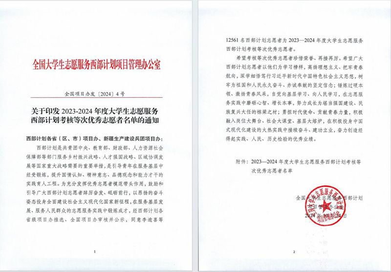 近日,在全国西部计划项目办发布的《关于印发2023-2024年度大学生志愿服务西部计划考核等次优秀志愿者的通知》中,我院兴边富民志愿者铁建学院姜文达同学,获评全国2023-2024年度大学生志愿服务西部计划考核等次优秀志愿者。