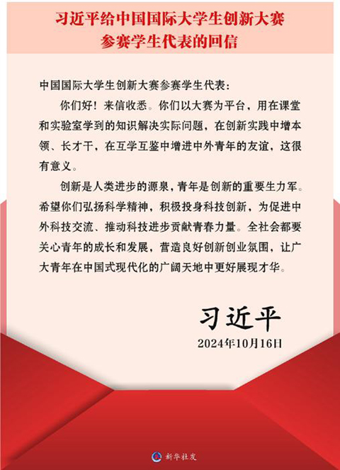 近日,中共中央总书记、国家主席、中央军委主席习近平给中国国际大学生创新大赛参赛学生代表回信,对学生予以亲切勉励并提出殷切希望。习总书记在回信中充分肯定了青年学生在创新实践中所做出的努力,并强调了创新的重要性以及青年作为创新生力军的关键角色。这一信件内容无疑对我院师生产生了深远的影响,激励了我们更加积极地投身于科技创新活动,为实现科技自立自强贡献力量。