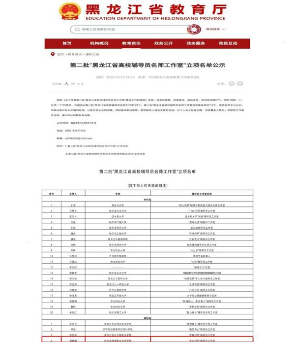 近日,中共黑龙江省委教育工作委员会公布了第二批黑龙江省高校辅导员名师工作室遴选结果,通过个人申报、学院推荐、资格审核、通讯评审、现场答辩等环节,我院交通运输学院党总支副书记、副院长谭春梅主持建设的“复兴领航”辅导员工作室成功入选第二批黑龙江省高校辅导员名师工作室。