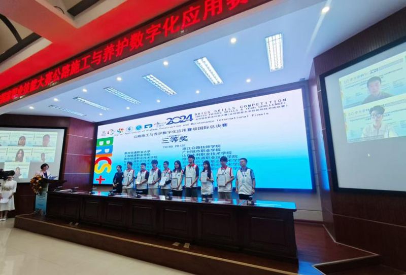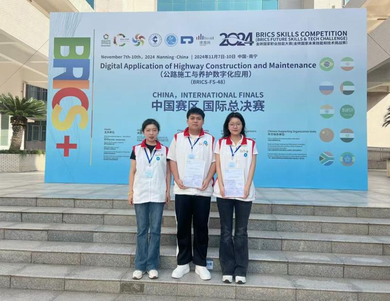 11月7日-10日,2024金砖国家职业技能大赛公路施工与养护数字化应用赛项国际总决赛在广西南宁广西交通职业技术学院举行,来自中国、越南、印尼、印度四个国家的47支参赛队伍的选手参加比赛。beats365官网城市轨道工程学院王婷、王鑫老师指导的马爽、王一涵两名学生凭借扎实的专业技能、出色的团队协作获总决赛三等奖。