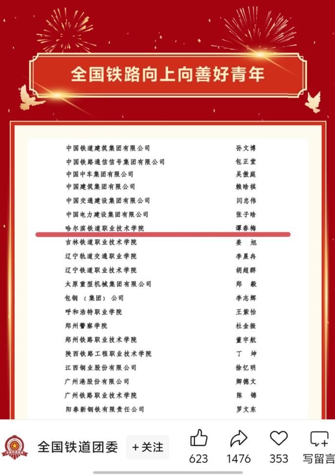 此次表彰,不仅是对芦秀婧、谭春梅、孙雨萌、张怀曲四位教师个人努力与成就的高度认可,更是我院长期以来坚持立德树人、服务铁路行业发展的生动体现。他们以实际行动展现了新时代铁路青年的奋进风采,成为了广大师生学习的楷模和榜样。展望未来,我院将以此次表彰为契机,进一步激励全体师生以先进典型为引领,传承和发扬铁路精神,在铁路事业的发展中勇担使命、砥砺前行。相信在榜样的示范带动下,会有更多的铁路青年在各自的岗位上绽放青春光彩,为推动铁路高质量发展、实现交通强国的宏伟目标贡献磅礴的青春力量!
