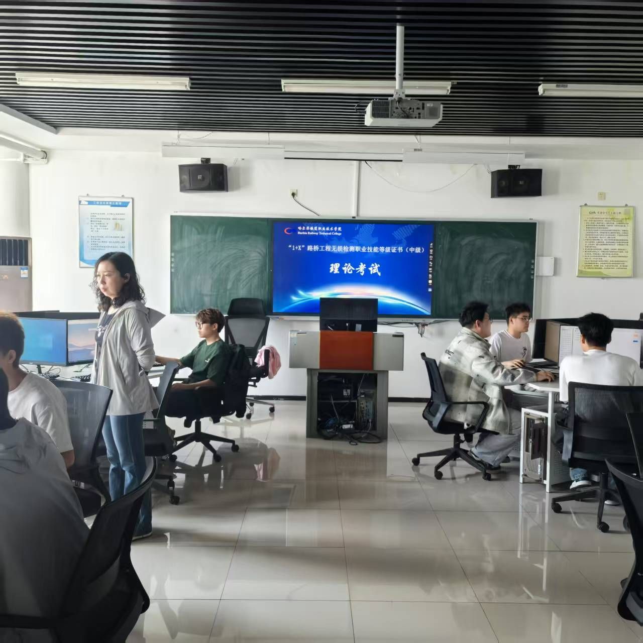 68名同学参与考核,采取“理论+实操”双模块模式。理论知识涵盖基桩锚杆、混凝土材料检测等路桥工程无损检测核心内容,实操包括钢筋保护层厚度及间距检测、锚杆长度检测、钢制护栏立柱埋深检测、预应力孔道灌浆缺陷检测、混凝土缺陷检测五项技能项目,全面对标行业技术标准。考前,学院组建专业团队整合课程内容与考核标准,开展集中培训及专家指导,并严格规范考务流程,确保考试顺利实施。