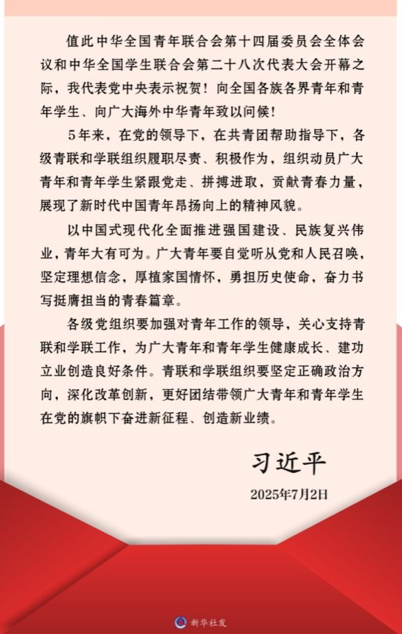 中华全国青年联合会第十四届委员会全体会议、中华全国学生联合会第二十八次代表大会7月2日上午在京开幕。中共中央总书记、国家主席、中央军委主席习近平发来贺信,代表党中央表示祝贺,向全国各族各界青年和青年学生、向广大海外中华青年致以问候。