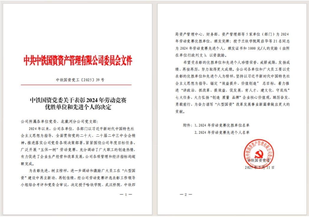 学院在2024年度公司“五保一树”劳动竞赛评选中,以实干担当创佳绩,荣获中铁国资“劳动竞赛优胜单位”称号,学院王凤、邢岩松、王垚三位优秀教职工,荣获“劳动竞赛先进个人”表彰。