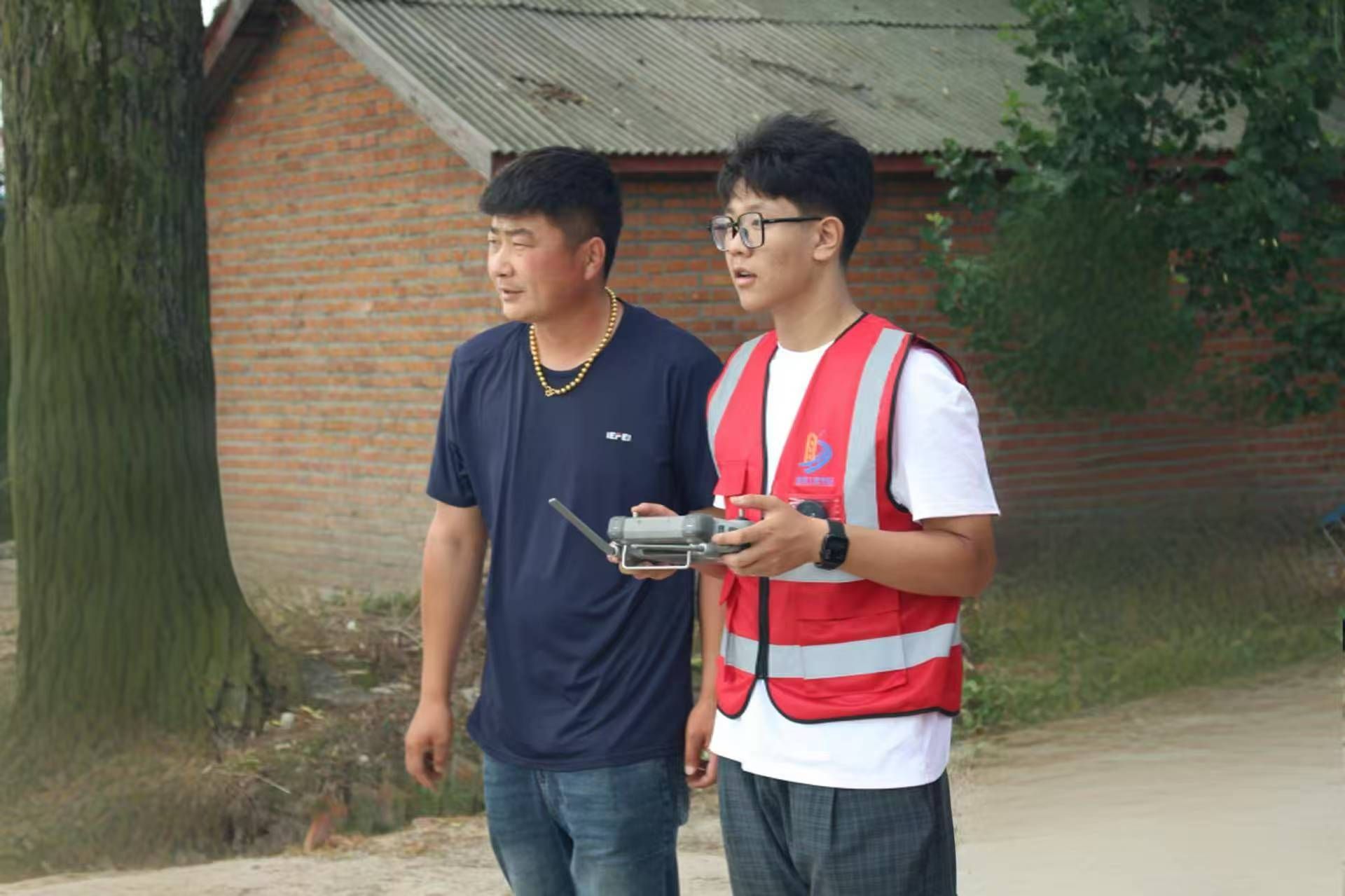 同日,队员在保山屯第一大队体验农用无人机,村民讲解其构造、应用与优势并演示,王百恒实操,感受科技助农力量。