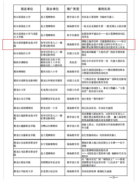 近日,从省文化和旅游厅、省教育厅获悉,在省文化和旅游厅、省教育厅联合开展的构建“大思政课”格局 推动革命文物进校园活动中,由我院马克思主义学院联合侵华日军第七三一部队罪证陈列馆,共同申报的案例《国殇之地淬信仰 交通强国践初心——beats365官网与侵华日军第七三一部队罪证陈列馆构建沉浸式思政育人体系》,成功获评为入围案例。