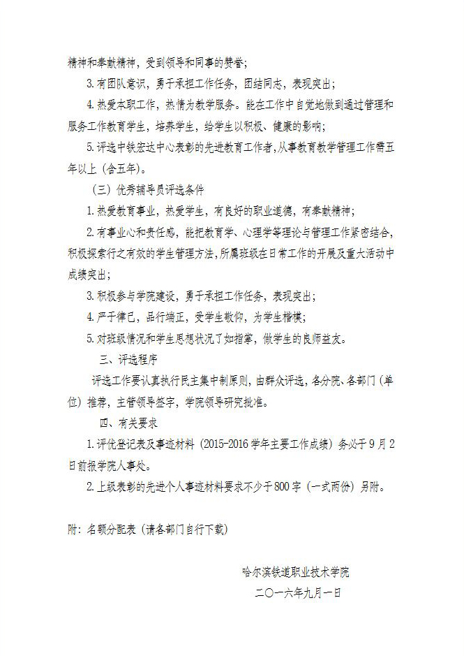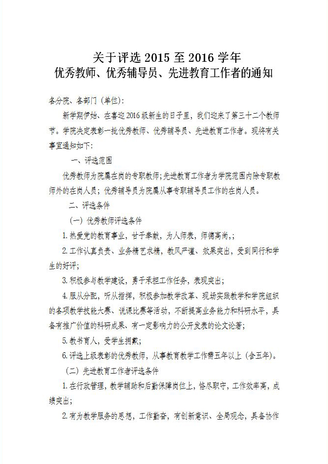 关于评选2015至2016学年优秀教师、优秀辅导员、先进教育工作者的通知