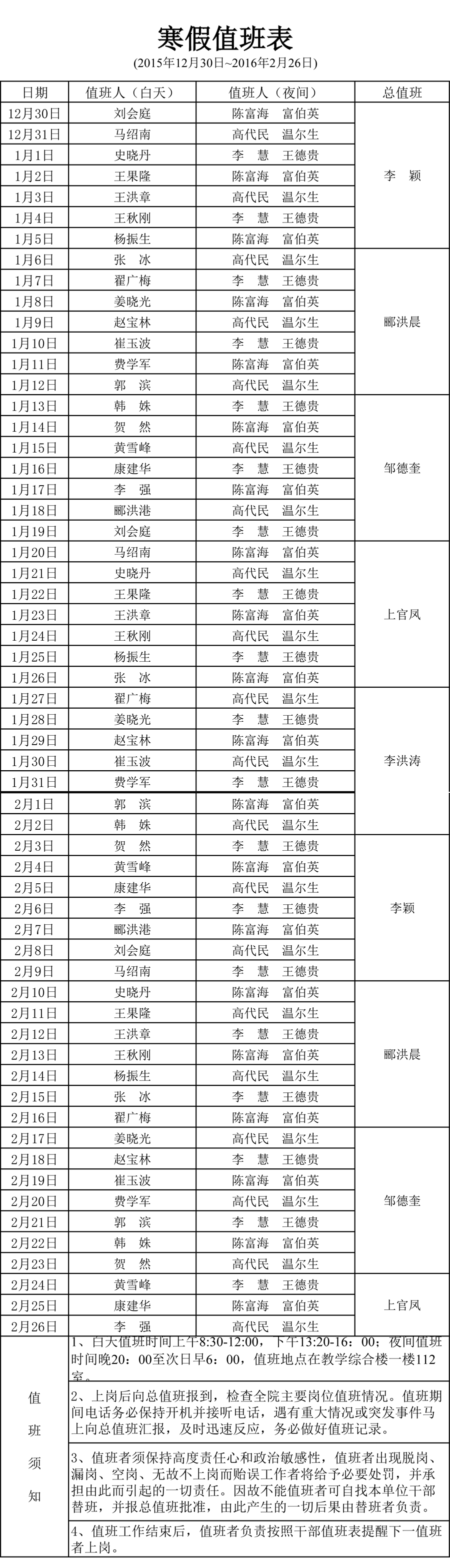 2016年寒假假期值班表
