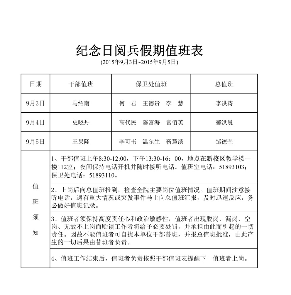 2015年纪念日阅兵假期值班表