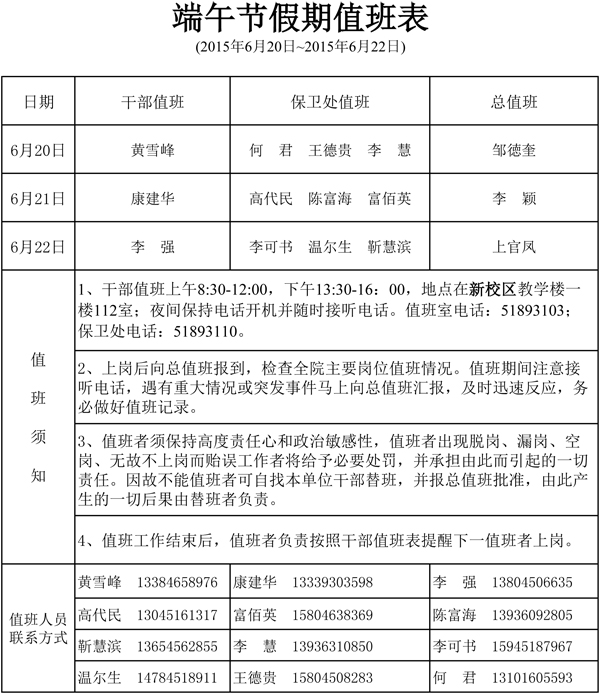 端午节假期值班表