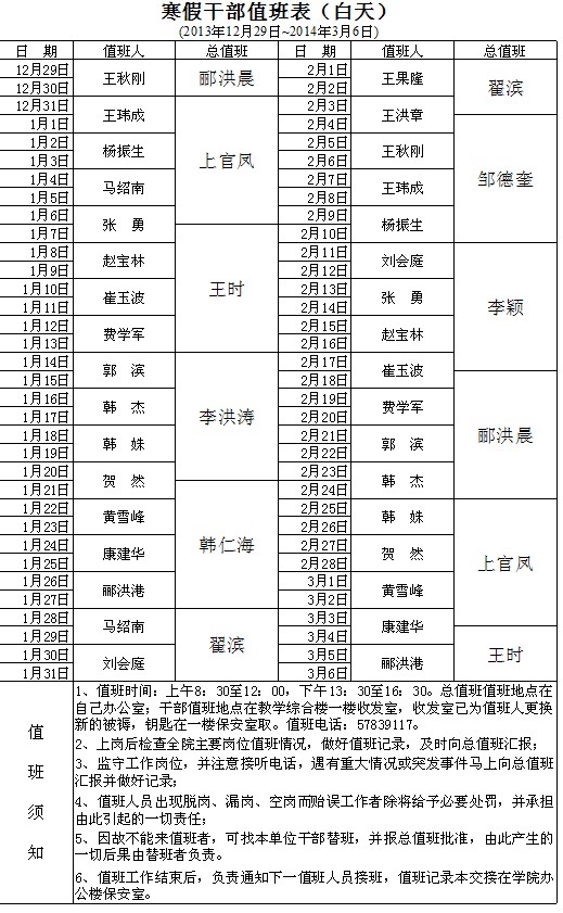 干部寒假值班表(白天)