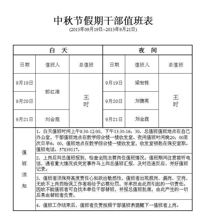 中秋节假期干部值班表