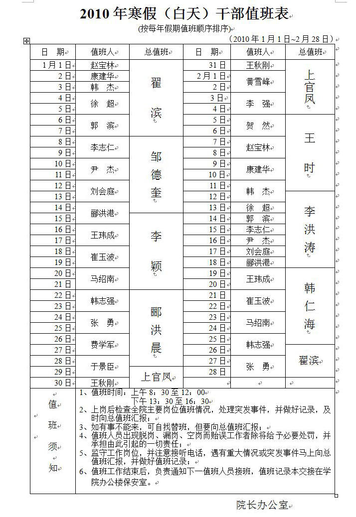 2010年寒假(白天)干部值班表
