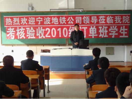 2012年10月20日,宁波地铁公司党委副书记兼副总经理王晔、客运部部长燕玲、人力资源部副部长徐晓晓和工务中心副主任赵宁宁一行四人来我院对2010级宁波订单班进行考核验收工作。我院教学院长李颖、教务处处长王洪章、城轨学院院长于景臣、城轨学院副院长张冰和轨道线路运营维护专业部部长陈惠哲等参加了本次为期三天的考核验收工作。