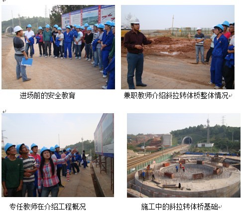 在桥隧公司四分部桥梁第二作业队的协助下,沪昆客专现场教学湖南段2010级高速铁道技术专业1、3班和桥隧施工与维护专业1、2班在施工技术人员带领下,分批次参观了沪昆客专长沙枢纽南西、西北上联络线特大桥(32+80+112)m预应力混凝土斜拉转体桥的基础施工。