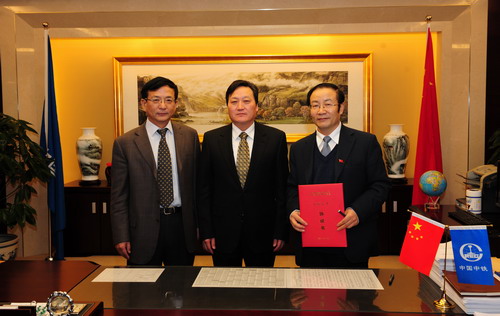 中国中铁总裁白中仁(中)、副总裁马力(左一)、院长韩仁海(右一)